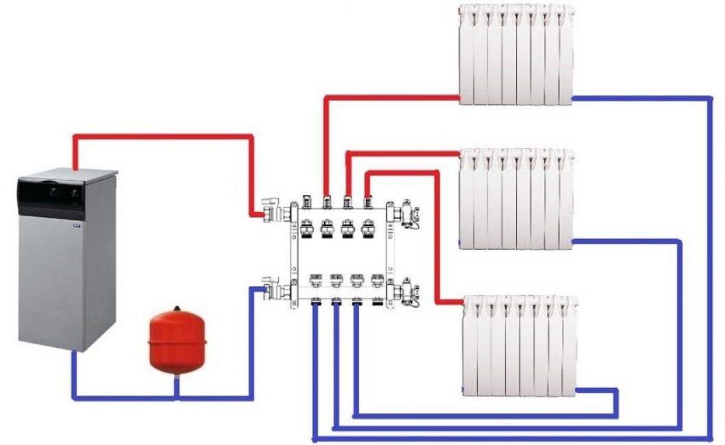 Преимущества: хорошая регулировка системы отопления, возможность отдельного отключения каждого отопительного прибора, отсутствие перерасхода отопительных приборов.