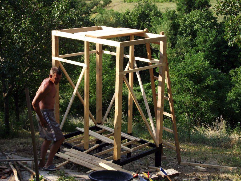 Для изготовления каркаса используют бруски и доски 30 мм х 150 мм. Сначала из досок сооружают основание размером 100х100 см. К доскам прибивают 4 бруса сечением 100х70 мм. В качестве перевязки каркаса нужны поперечные и боковые перемычки, которые вставляют в пазы. Они выполняют дополнительные функции – усиливают крышу для установки накопительного бака.