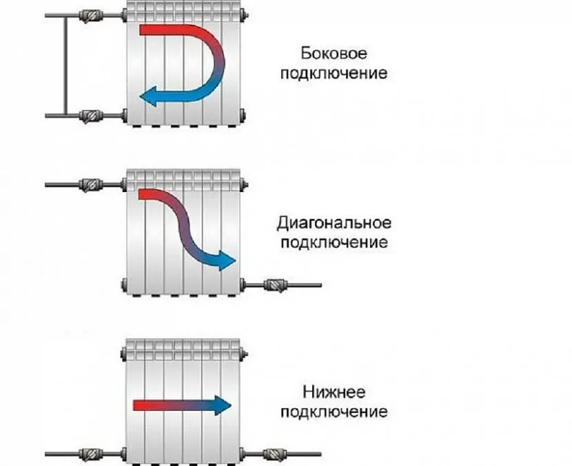 Диагональное — сверху на одной половине радиатора размещается вводная труба, а снизу на другой половине — выходная. Наилучший вариант, потому что обеспечивает наименьшие теплопотери.