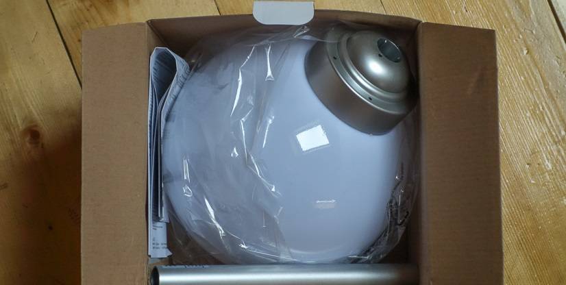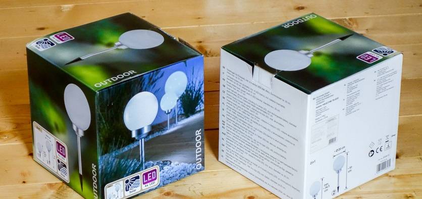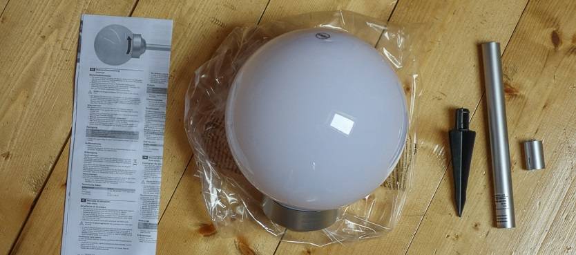 В коробке находится сам светильник в сборе, отдельно две “ноги” – короткая и длинная. Еще есть пластиковый черный наконечник, который втыкается в землю, и инструкция.