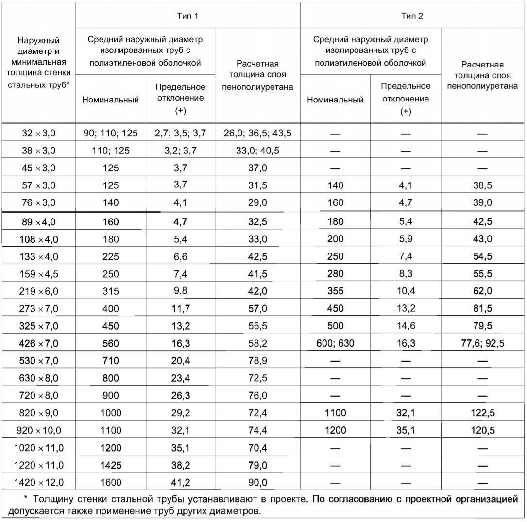 Трубы в изоляции ППУ производятся двух типов: тип 1 – стандартный, тип 2 – усиленный, имеющий увеличенную толщину пенополиуретанового изоляционного слоя согласно техническим требованиям заказчика, исходя из определенных условий укладки трубопровода, температуры транспортируемой жидкости и окружающей среды, расчета показателей тепловых потерь.