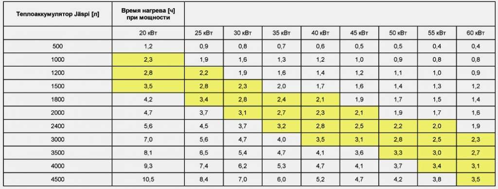 | Теплоаккумулятор Jaspi (л) | Время нагрева (час.) при мощности | ||||||||