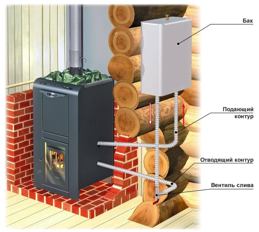 Если для прогрева бани применяется классическая дровяная печь, то для нагревания воды в накопительном баке необходимо установить теплообменник. Он позволит значительно сократить расходы. Например, отпадет нужда в электрическом бойлере.