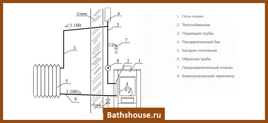 Во всех моделях генератора для печей имеются две присоединительные трубы. Одна из труб расположена выше, другая ниже. Холодная жидкость поступает внутрь устройства по нижнему патрубку принудительным или естественным методом. Горячая жидкость поднимается, по верхней трубе поступает в накопительную систему. От объема накопителя зависит, сколько горячей воды постоянно доступно для мытья. Бак располагается в парилке, моечном отделение. Состоять система может из двух баков или металлической спирали, бака.