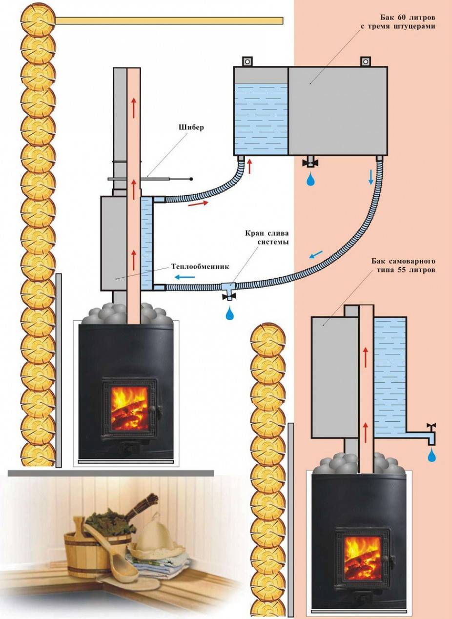 Устройство служит для нагрева воды в бане. Его принцип работы основан на физических свойствах горячей воды, расширяющейся и поднимающейся вверх, а холодная при этом остается внизу.