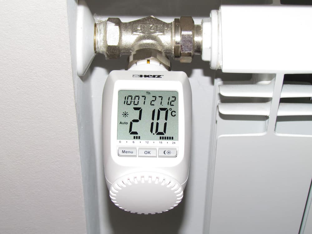 Принцип действия программируемых термостатов для радиаторов очень похож на уже рассмотренные в этом обзоре механические головки: тот же шток, открывающий и закрывающий клапан, та же чувствительность к температуре окружающего воздуха. Но за все это уже отвечает микропроцессор, который считывает замеры датчика и пересылает команду на сервопривод. Естественно, цена на такие «умные» приборы гораздо выше.