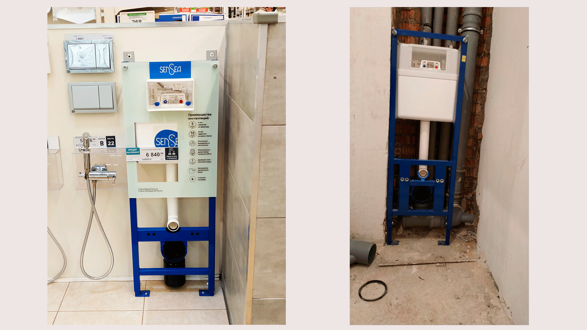 Инсталляция для подвесного унитаза: слева – на витрине магазина, справа – встроенная в стену в туалетной комнате