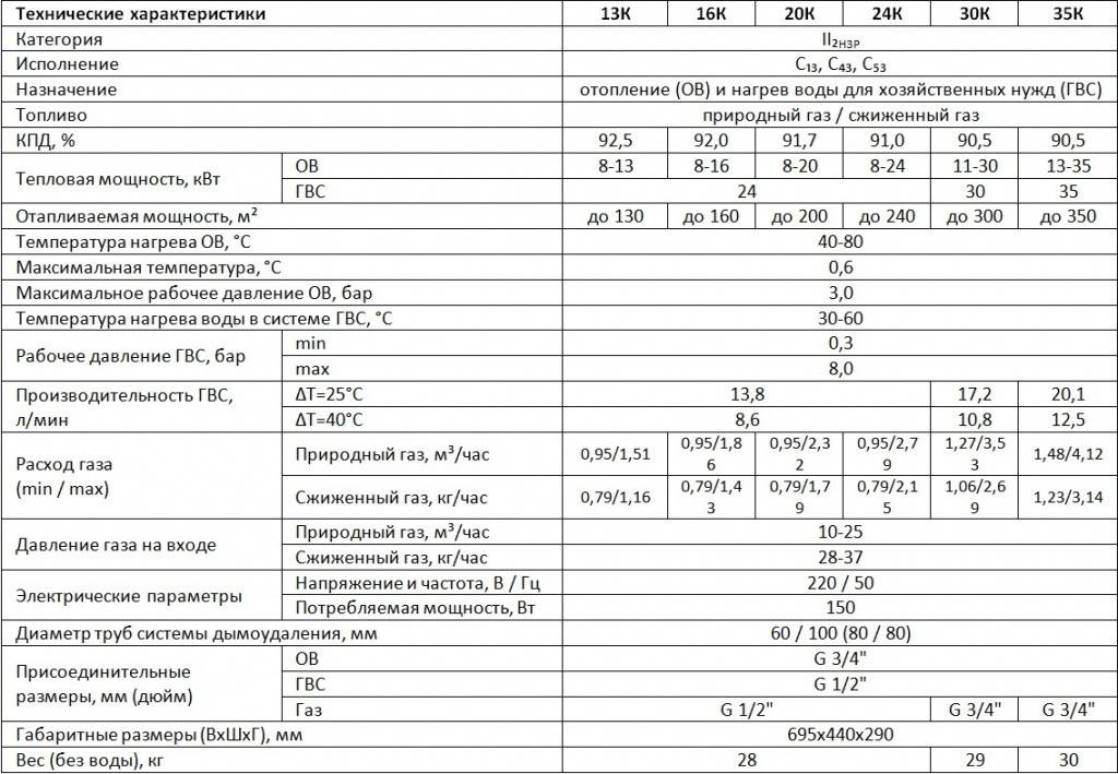 Имеет сравнительно небольшую мощность от 9 до 24 кВт. Однако этой мощности вполне хватает для отопления и горячего водоснабжения частного дома площадью до 240 м2. Вот некоторые технические характеристики, которыми обладает любой двухконтурный котел этой серии: