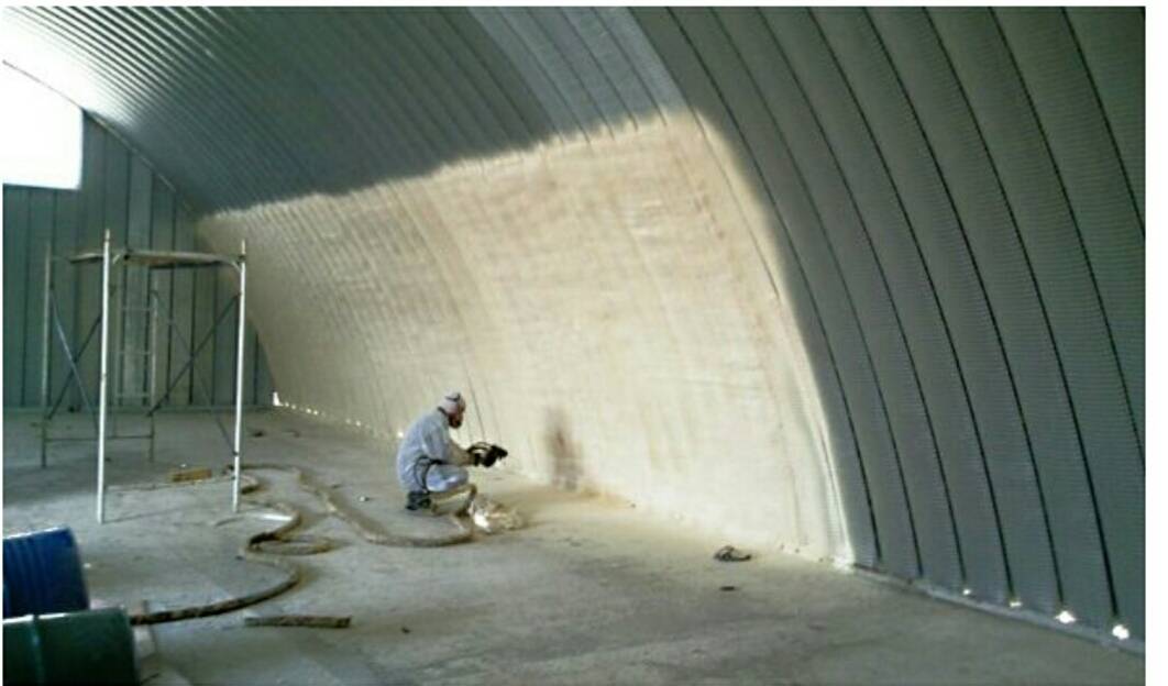 Напыление пенополиуретана. Состав наносится на рабочую поверхность с помощью специального распылителя. Вступая в химическую реакцию с воздухом, он преобразуется в пену. Материал наносится несколькими слоями толщиной 10 – 15 мм с интервалом в несколько минут. Производить работы следует по направлению снизу вверх, заполняя все щели и пустоты. Затвердевание пенополиуретана происходит в течение нескольких секунд. Материал принимает форму ангара и формирует с основанием единую конструкцию. Спустя 2 часа, прочность покрытия достигает 95 %. Через сутки все показатели термоизолятора соответствуют нормам.