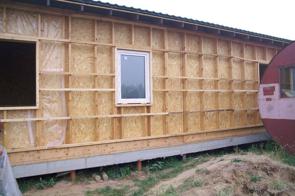 Пятый этап. Отделка фасада может быть выполнена с использованием сайдинга, вагонки, блок-хауса и других материалов, имеющих относительно небольшой вес. Обшивать стены следует, набив контррейки толщиной 40 мм поверх ветрозащитного барьера. Это обеспечит вентиляцию системы.