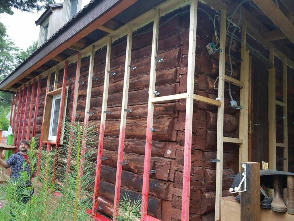 Обрешетку рекомендуется выровнять до получения строго вертикальной плоскости, чтобы утеплить брусовой дом снаружи было проще. Весь пиломатериал, используемый в «пироге», предварительно обрабатывают антисептиком и антипиреном.