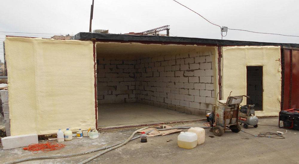 Пенополиуритан высоко ценится владельцами гаражей за стойкость к внешней среде. После нанесения он расширяется, устраняя все пустоты и щели, и надежно прилегает к материалу стены, поэтому под ним не может собираться конденсат. Когда пенополиуретан затвердевает, образуется плотный гидрофобный слой. Материал не горит и может служить более 50 лет.