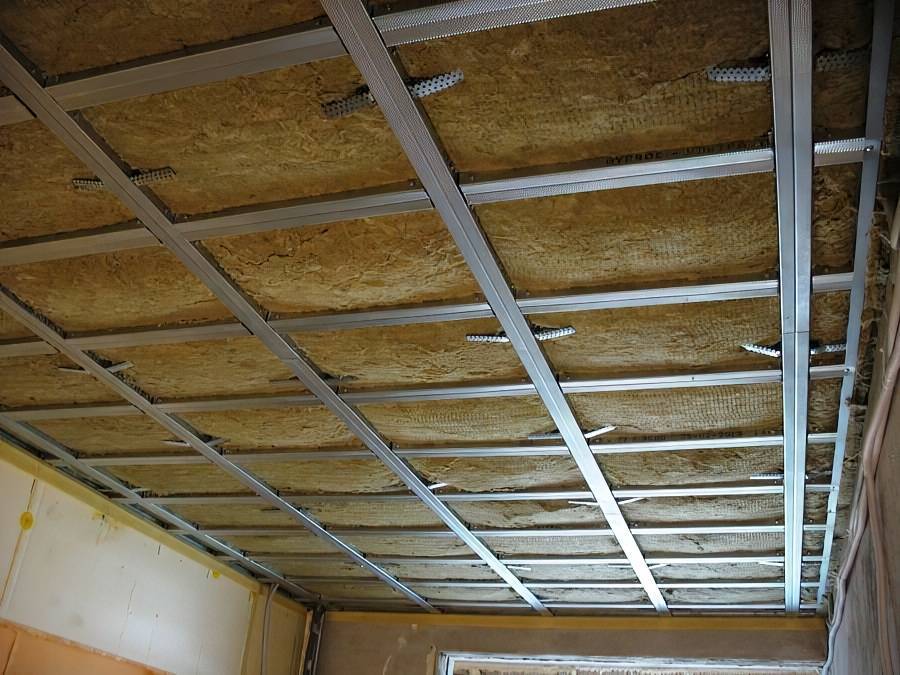 Подшивание потолка происходит с одновременным монтажом утеплительного слоя.