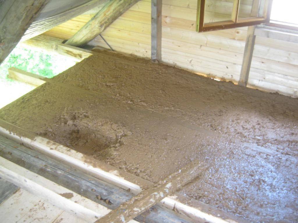 Используется только в строениях с прочными перекрытиями. Толщина выкладки 30-40 мм, теплопроводность глины ниже, чем у минеральной ваты, керамзита. К достоинствам материала относят экологичность, доступность. Процесс выкладки отличается трудоемкостью, монтаж только со стороны чердака. В процессе сушки поверхность глины покрывается трещинами, их нужно будет заделать, для чего используется тот же состав, что и для основного слоя.