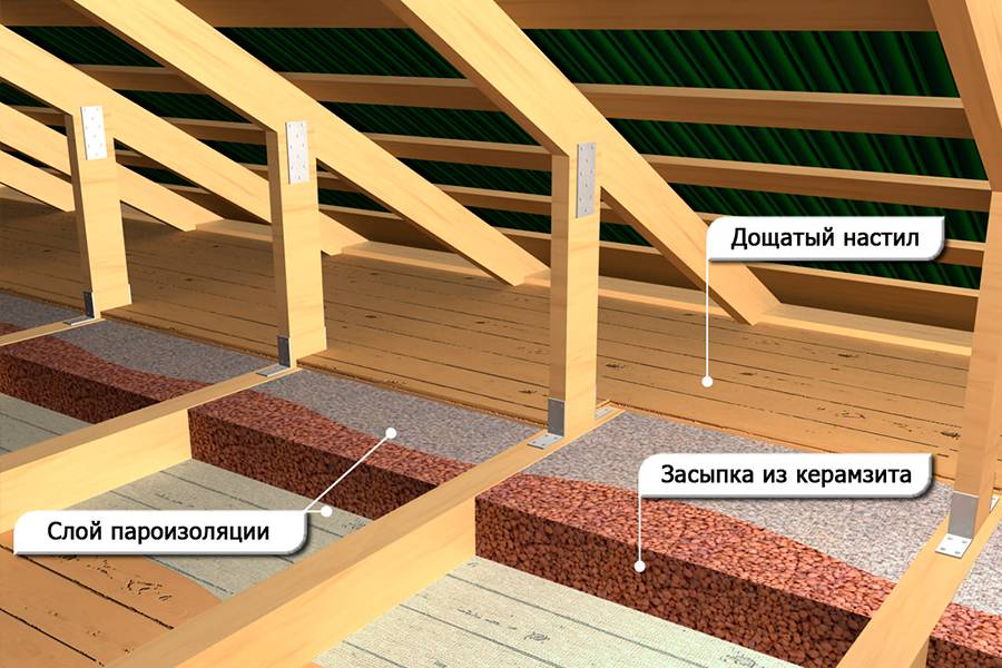 - сверху укладывается минеральная вата, засыпается керамзит — слишком толстый слой запрещен из-за повышения нагрузки на потолок;