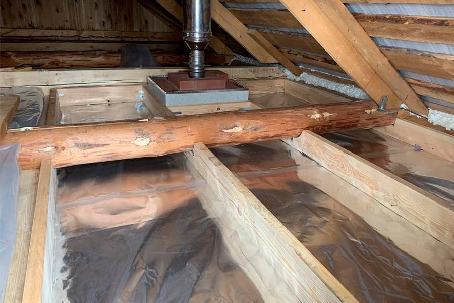 - Всю конструкцию накрывают паронепроницаемой пленкой таким образом, чтобы были закрыты и доски чернового пола и деревянные балки.