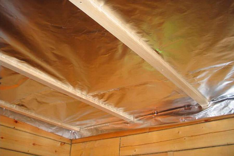 - На фольгу крепится утеплитель, заполняющий собой пространство между деревянными брусками. Потолок лучше формировать в несколько слоев гидроизоляционного материала с учетом перекрытия стыковых мест.