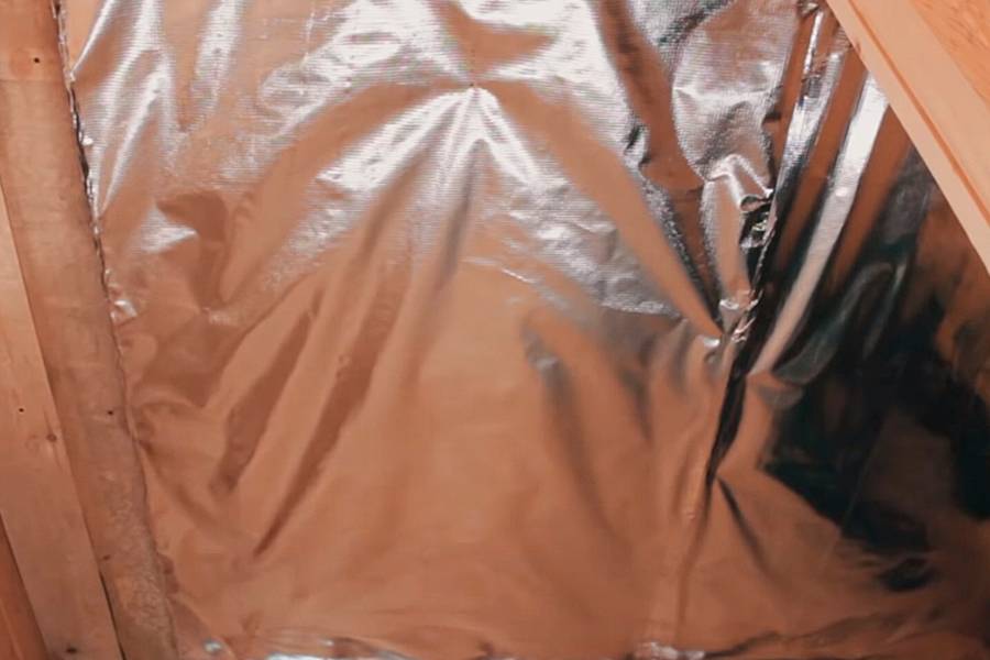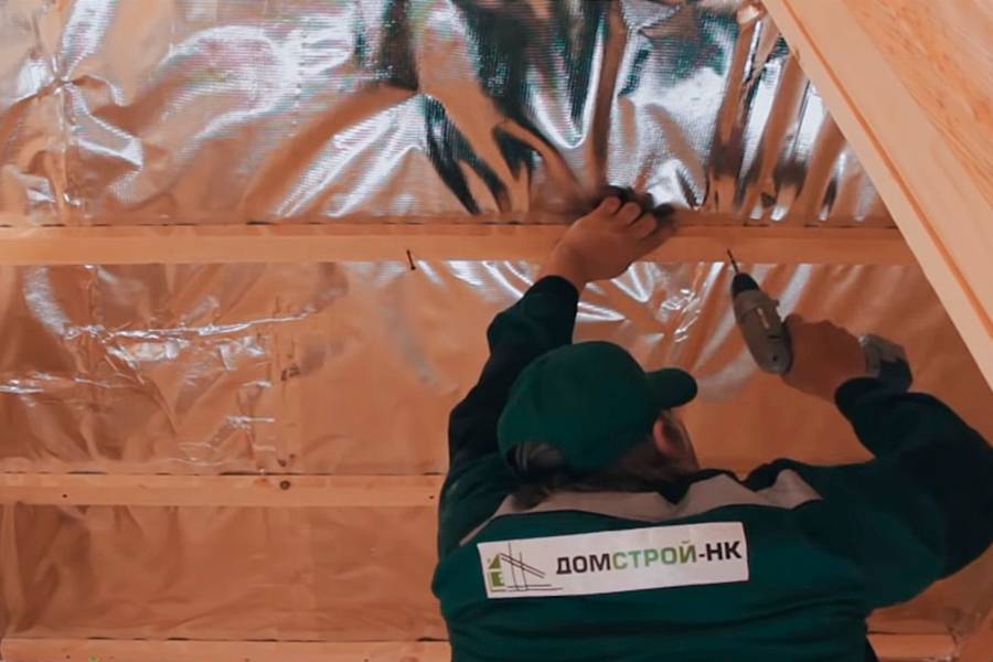Шаг 1. На потолок изнутри крепится фольга или любой другой пароизоляционный материал. Полосы укладываются внахлест 10-15 см, с заходом на стены на 15-20 см. Крепление производится скобами, клеем или планками. Швы проклеиваются металлизированным скотчем. Им же закрываются скобы или головки метизов. По стенам лучше всего крепить планками или рейками для обрешетки.