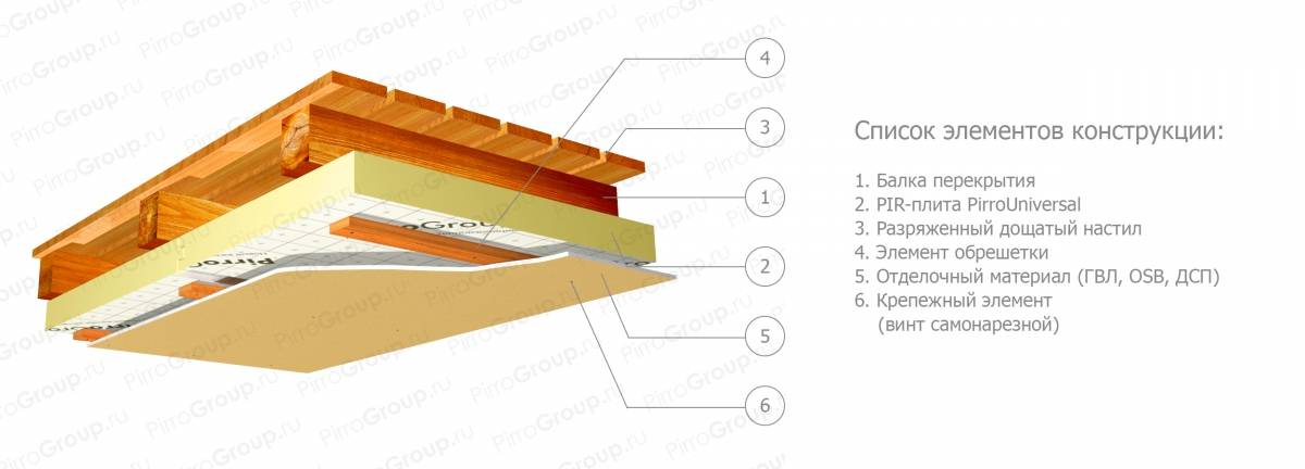Для железобетонных перекрытий требуется обустройство фальш-потолка, задача которого снизить теплопотери через бетон. Фальшпотолок представляет собой подвесной потолок – потолочная конструкция с теплоизоляционным слоем значительной толщины (предполагает впоследствии декоративную отделку).