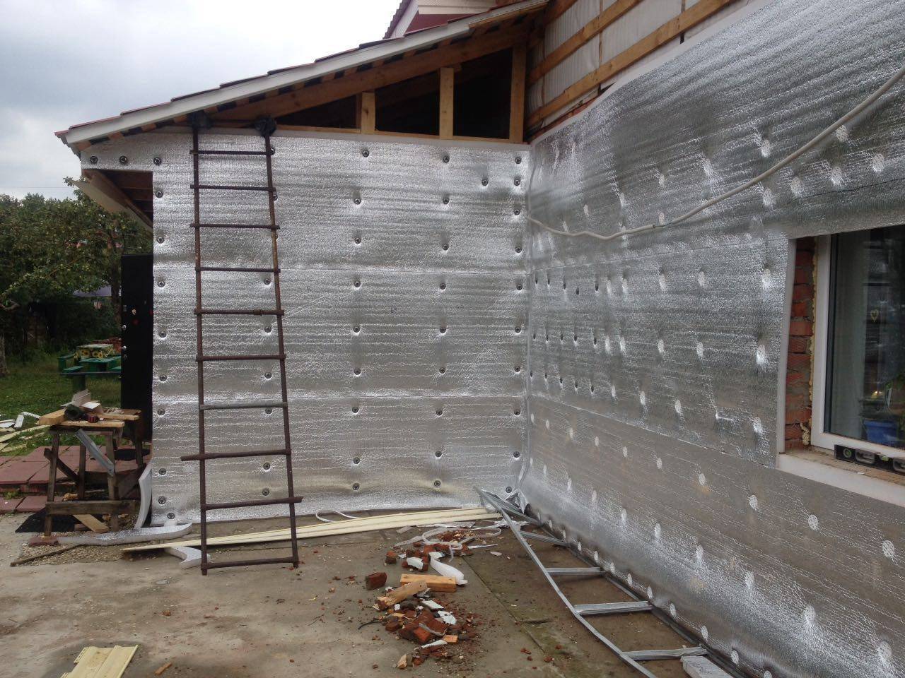 Поскольку большая часть теплопотерь происходит из-за инфракрасного излучения (это примерно около 60-65%), поэтому массивные теплоизоляционные материалы не обеспечивают достаточно хорошую защиту дома от теплопотерь. Основным материалом, который способен инфракрасные лучи вернуть обратно – это алюминиевая фольга. Стены здания, которые имеют такую защиту, зимой тепло возвращают во внутрь здания, а в летную жару тепловое излучение отражают наружу.
