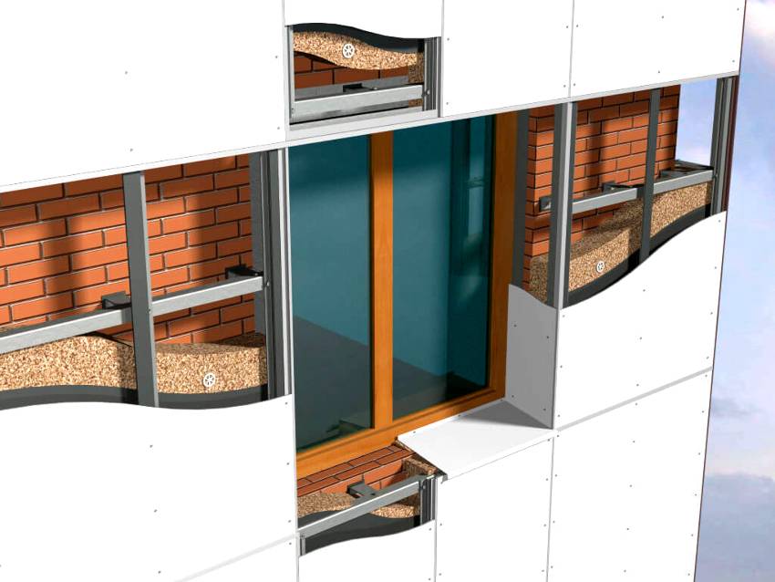 Для монтажа теплоизоляции используются анкеры, облицовочные панели устанавливаются на детали крепежной подсистемы.