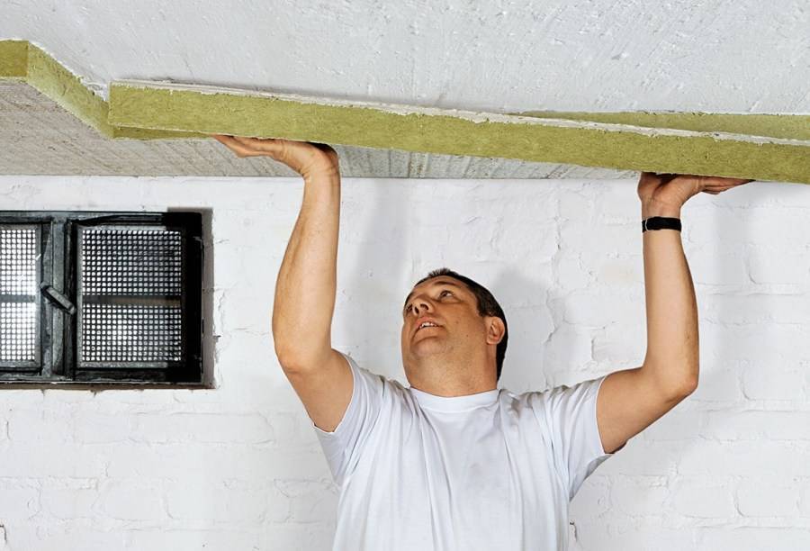 - Теперь можно приступать к монтажу самой каменной ваты. На ее тыльную сторону нанесите полимерный клей и зафиксируйте на поверхности, действуя по направлению снизу вверх и прижимая их не слишком сильно. В дополнение к этому вбейте в плиты пластиковые дюбеля. Во время работы следите за тем, чтобы листы утеплителя стыковались плотно и не образовывали щелей между собой.