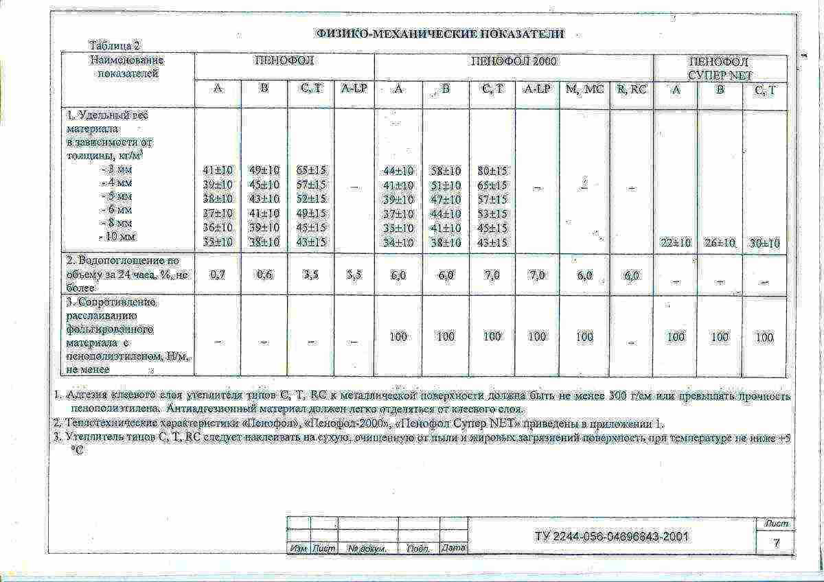Например, рассматривая физико – механические показатели, которыми обладает пенофол, видно, что, чем меньше способность к водопоглощению, тем выше требования к содержанию влаги в материале стен дома – при оклеивании может не произойти достаточного сцепления (влаге некуда впитываться). Сопротивление расслаиванию материала также нормируется не у всех марок (см. таблицу):