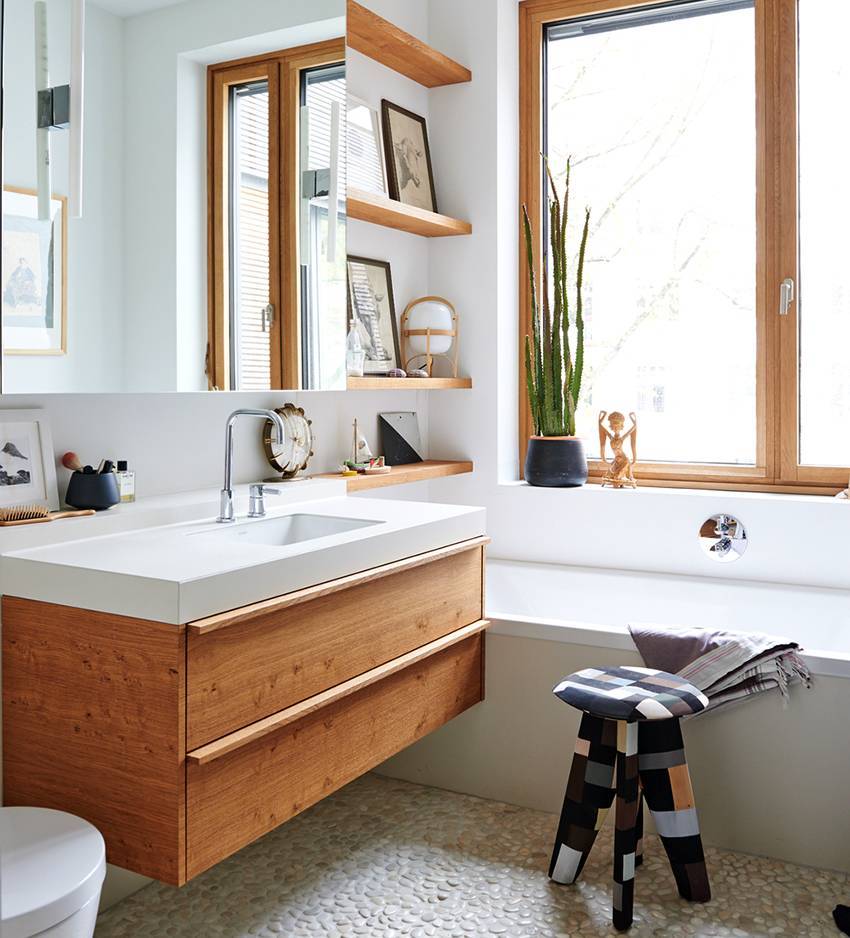 В других помещениях скандинавского стиля древесину используют не только для изготовления мебели, но и для отделки стен, пола и потолка. Однако ванная комната с ее постоянными колебаниями влажности и температуры – это серьезное испытание для натуральной древесины, поэтому ее можно заменить более стойкими современными материалами.