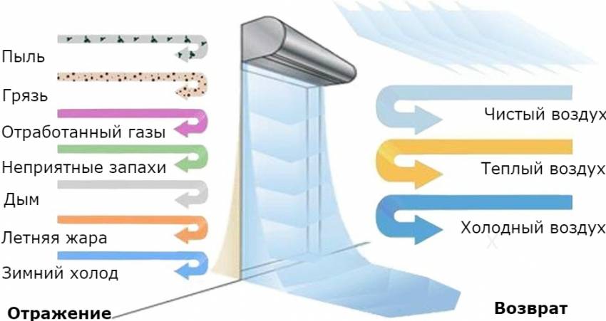 Независимо от сезона, завеса выполняет еще одну немаловажную функцию. Она ограждает внутренний микроклимат помещения от проникновения вместе с уличным воздухом различных вредных для здоровья человека взвесей. Завеса способна удержать дождь, снег, пыль и полчище мелких насекомых.