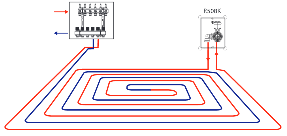 Достоинство данной схемы подключения водяного теплого пола в легкой установке. Применяются подобные комплекты, когда малая площадь теплого пола, малое помещение с нечастым пребыванием жильцов. Не рекомендуется устанавливать в спальнях. Подойдет для отопления санузлов, коридоров, лоджий, и т.д.