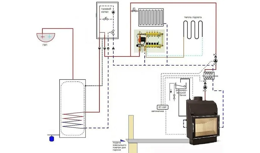 Камин с водяным отопительным контуром можно подключать, используя принципиальную схему, как на изображении выше: