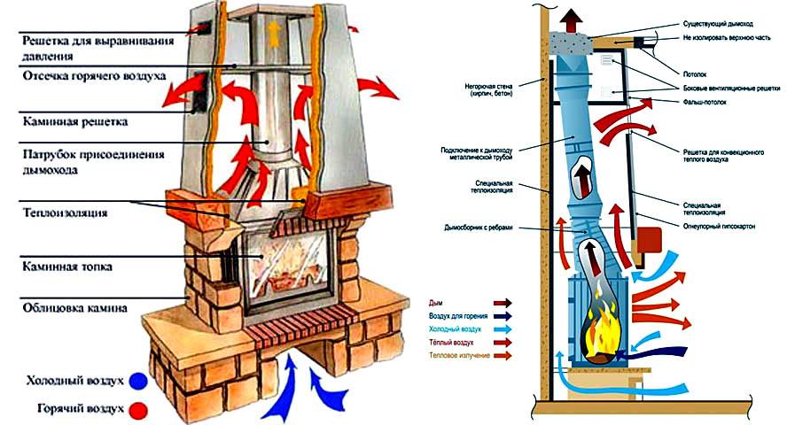Камины для воздушного отопления дома схожы по строению с аналогами, имеющими водяной контур. Интерес составляет процесс выведения продуктов горения из системы.