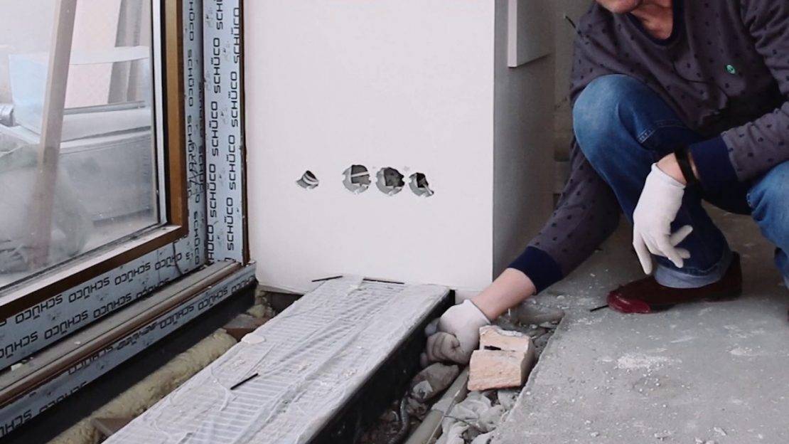 Сначала устройство крепится на стену посредством кронштейнов – под них пробуриваются отверстия. После того как подвесы зафиксированы, навешивается батарея.