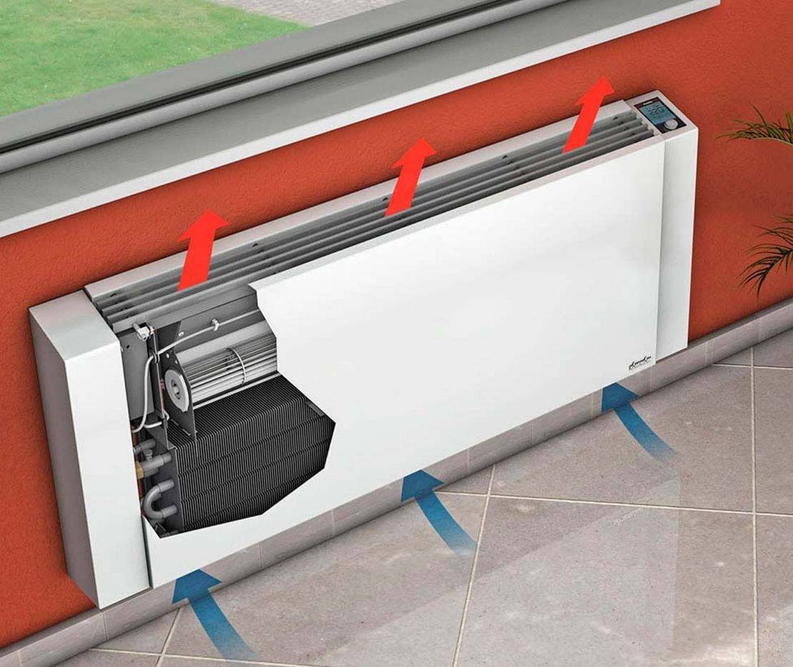 Фото 4. Схема и принцип работы водяного конвектора отопления, встраиваемого в пол. Прибор оснащен вентилятором.