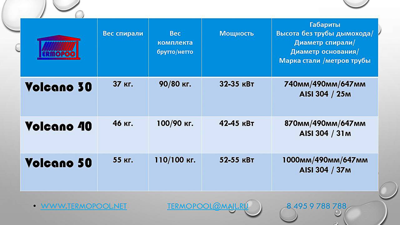 Флагманом линейки нагревателей TERMOPOOL является модель VOLCANO PRO 50.В его комплектацию входит всё необходимое для полноценного и быстрого нагрева воды. А именно: Армированная нержавеющей проволокой спираль 36м (труба нержавеющая сталь AISI 304 32*2мм) , покрытая изнутри термостойкой эмалью до 1000 градусов. Крышка выполнена из нержавеющей стали AISI 304, (3мм) с применением усилений из нержавеющего квадрата 15мм и декоративными элементами, так же выполненными из нержавеющей стали. Дымоход изготавливается из нержавеющей стали. Состоит из из двух труб 0,5м, диаметром 140мм, задвижки и дефлектора. Экран из нержавеющей стали 0,8мм, который полностью закрывает спираль. Подставка (выполненная из стали 5мм и изготовлена с применением лазерной резки) покрыта термостойкой эмалью. Колосник выполнен из чугуна толщиной 20мм. Зольная чаша из нержавеющей стали. Кольцо/Кожух с декоративной резкой и дверцей для удобного извлечения золы.( из нержавеющей стали толщиной 0,8мм) высота 180мм.