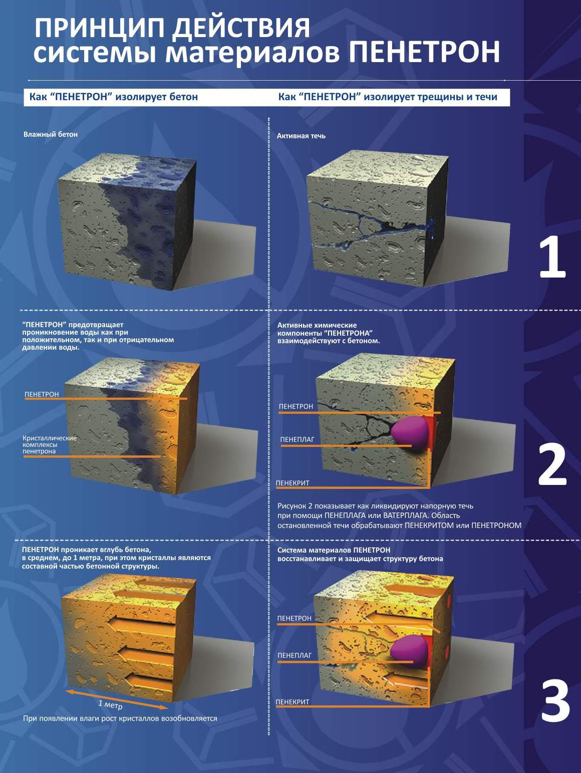 Любопытно, что Пенетрон и его аналоги обеспечивают в некотором роде самовосстанавливающуюся гидроизоляцию. Там, где в бетон по новым трещинам и порам начинает проникать вода, тут же возобновляется рост кристаллов кальциевых солей. Что особенно радует — гидроизоляционные мероприятия можно проводить при сырых стенах или фундаменте.