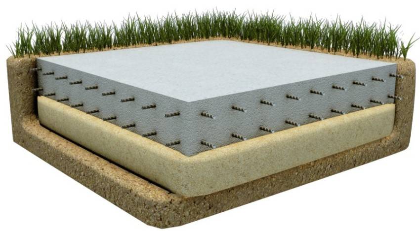 Уже на этапе проектирования глубина котлована и толщина плиты рассчитываются таким образом, чтобы поверхность плиты возвышалась на 50-60 мм над землей.