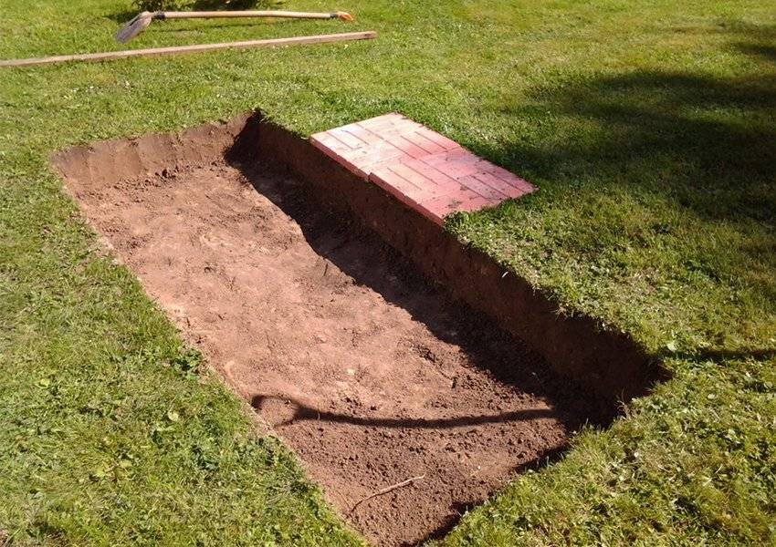 - Выкопать котлован глубиной 0,1…0,5 м (в зависимости от грунта), выровнять неровную поверхность.