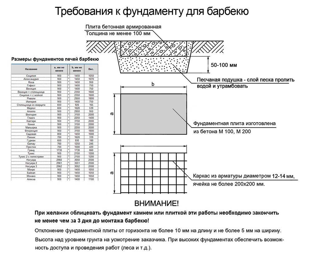 Если печь барбекю сравнительно небольшая, достаточно, чтобы толщина плиты была меньше 10 см. Для большого комплекса печей параметры плиты лучше рассчитывать исходя из свойств грунта и общей нагрузка на базу. В этом случае может потребоваться затирка плиты толщиной 12-15 см.