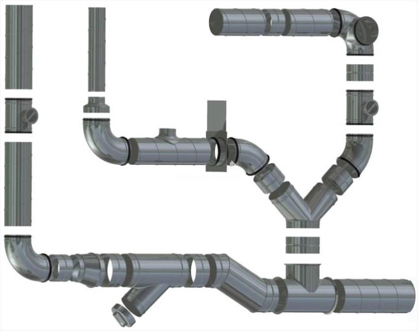 Полимерный материал используется для производства не только воздуховодов, но и всех фасонных элементов. Кроме самих труб потребуются нижеуказанные аксессуары.
