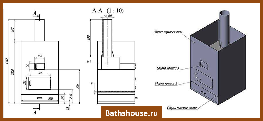 Фото 1. Чертёж металлической печи для бани (вид спереди, сбоку) и изображение устройства в готовом виде.