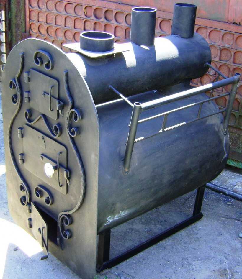 Самым простым вариантом печи из металла выступает буржуйка. В ее составе содержится кожуха с дверцей и ножками, а во внутрь устанавливают решетку. Именно на ней происходит сжигание дров. Также необходимо, чтобы на таком приспособлении для топки помещений был дымоход.